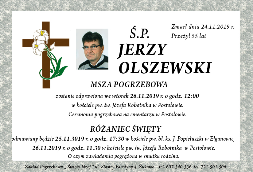 Wyświetleń: 176 | Opublikowano: 25 listopada 2019 | Dodany przez: Zakład pogrzebowy "Św Józef" Pobierz nekrolog. Powiadom na Facebook'u